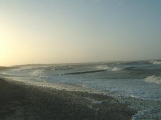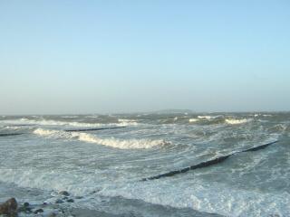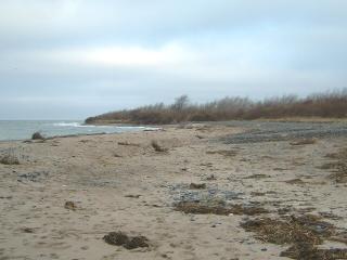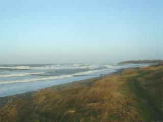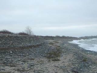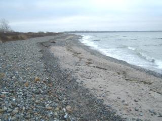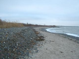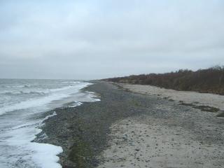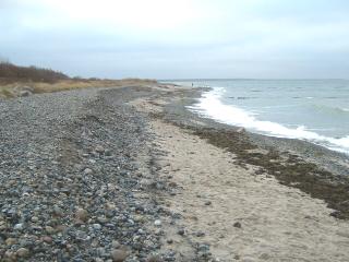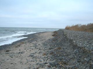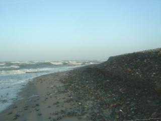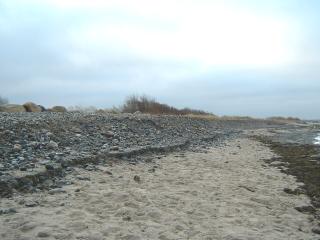 Über den gesamten Bereich der Steinaufspülung hat sich das Meer riesige Massen der Steine zurück geholt. Man muss sich eine Linie vorstellen, die von der Abbruchkante gleichmäßig bis ins Meer reicht. So war der Zustand nach der Fertigstellung. (Siehe Bilder vom 10.10.04) |